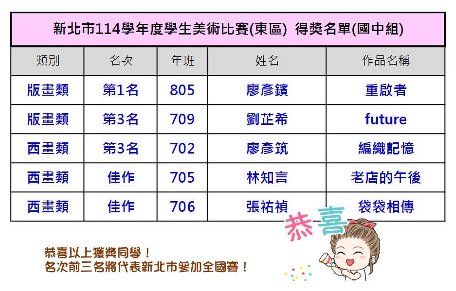 【國中部】賀!本校學生參加新北市114學年度學生美術比賽(東區)榮獲佳績!