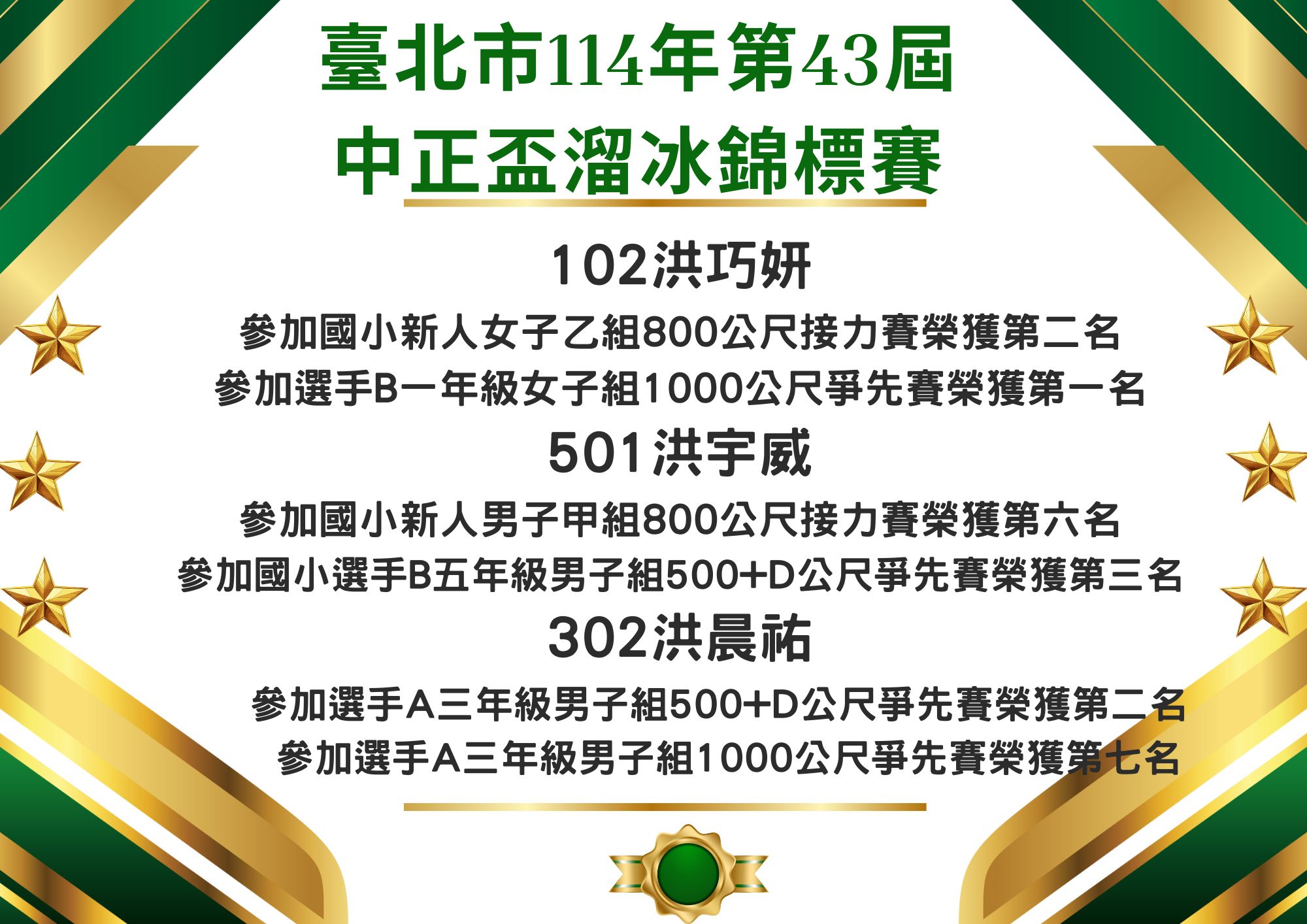 【國小部】賀~本校學生參加臺北市114年第43屆中正盃溜冰錦標賽榮獲佳績